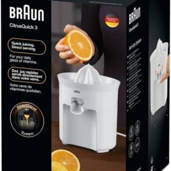 The Braun Tribute Collection Citrus Juicer CJ3050 is designed to make juicing simple, fast, and efficient. With its 60-watt motor, it extracts juice quickly while preserving the fruit’s natural flavor and nutrients. The automatic start/stop function begins juicing as soon as you press the fruit on the cone and stops when released — no buttons, no mess.