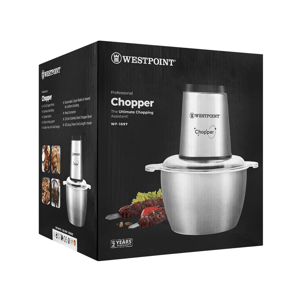 The Westpoint WF-1097W Professional Chopper is a powerful, efficient multi-purpose food chopper designed for everyday kitchen use. It features a large 2 L stainless-steel bowl, a robust AC full-copper motor, and a dual-speed button control. Built with safety in mind, it includes a safety-locking system, anti-skid rubber feet, and a durable stainless body. Ideal for chopping vegetables, nuts, meat and more, it delivers uniform results in a compact form.